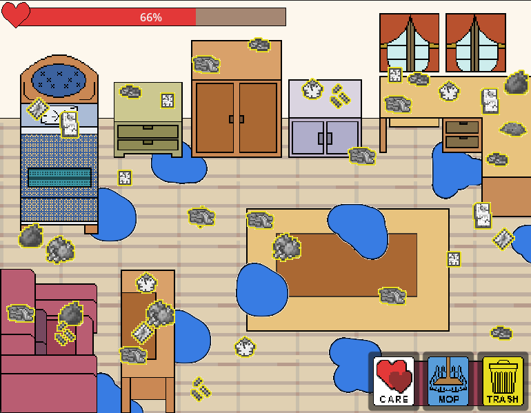 The player is able to "Take a break" in the middle of the cleaning session, where the game will pause for a while and increase the health meter of the player. This evokes the message that whenever anyone feels overwhelmed, it's always important to prioritize oneself and make sure that they feel better before continuing on whatever they are doing!